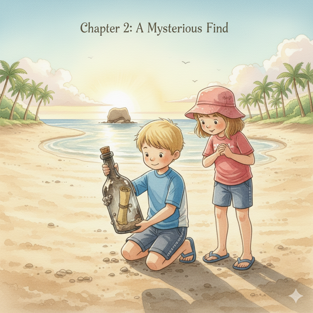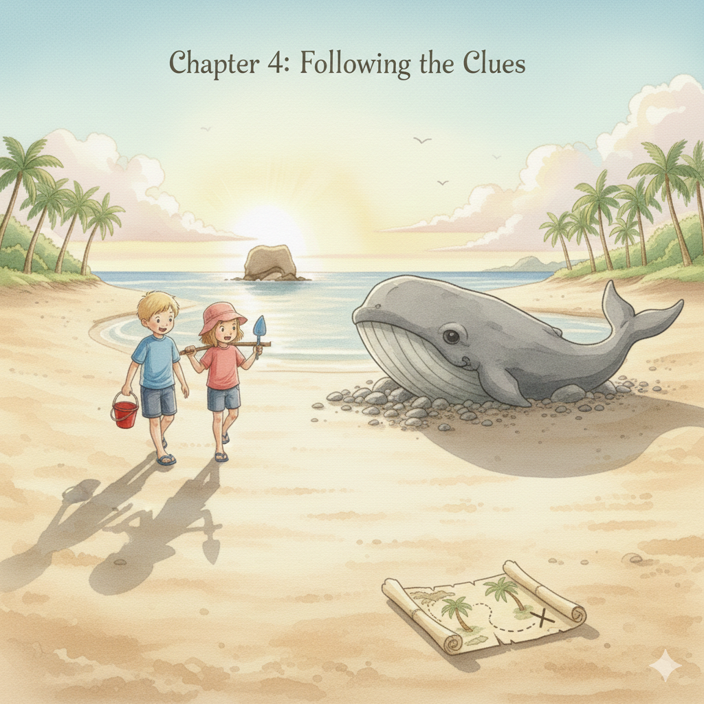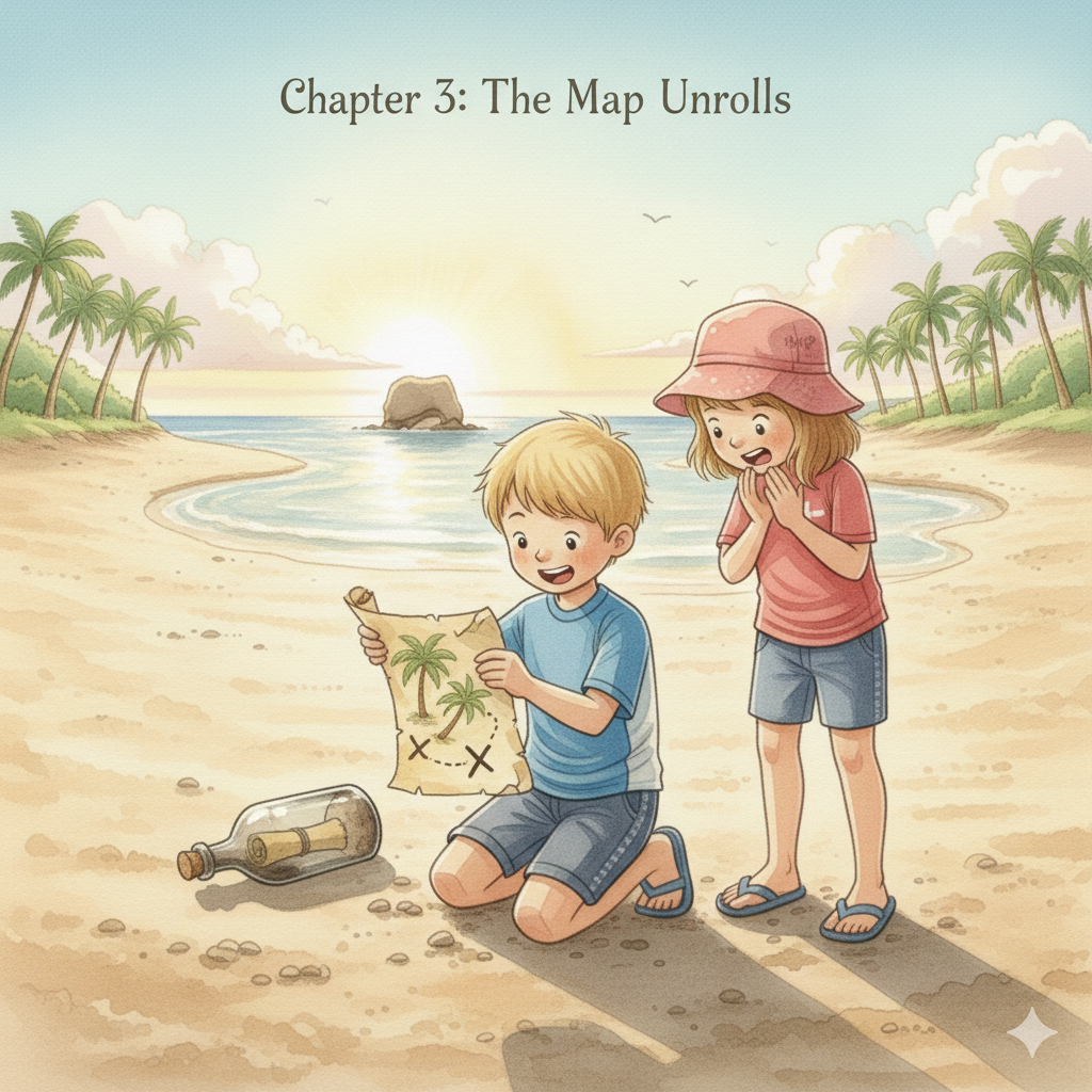 “It’s a message in a bottle!” gasped Jess. They pulled the paper out. It was a drawing. It showed three palm trees, a big rock shaped like a whale, and a dashed line ending at an ‘X’ mark. They knew exactly where the whale-rock was! It was at the far end of the beach.