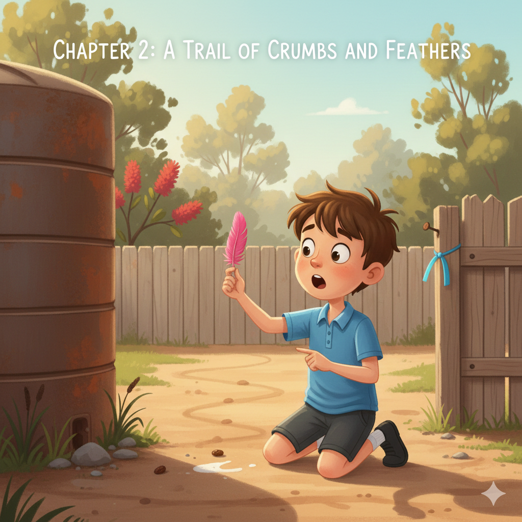 Right by the spot where the koala lid rested, he saw something tiny: a single, shiny sultana and a little smear of white bread crumb. But the most exciting clue was a fluffy, bright pink feather. It was about the size of his thumb.