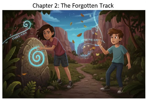 The next morning, Mia found a narrow path behind the campsite—overgrown and marked with faded footprints. Jayden hesitated, but Mia’s determination won out. They followed the track, ducking under branches and hopping over rocks until they reached a clearing with a strange stone circle.