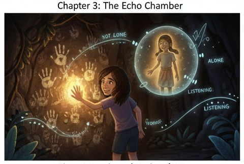 The cousins reached a cave hidden behind a curtain of vines. Inside, their voices echoed strangely—repeating not just their words, but their thoughts. Mia said, “We’re not alone,” and the cave echoed, “Not alone.”