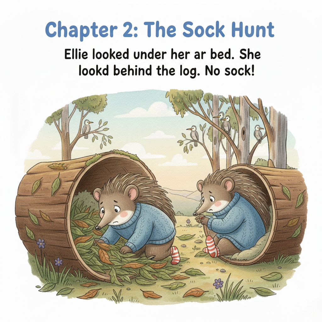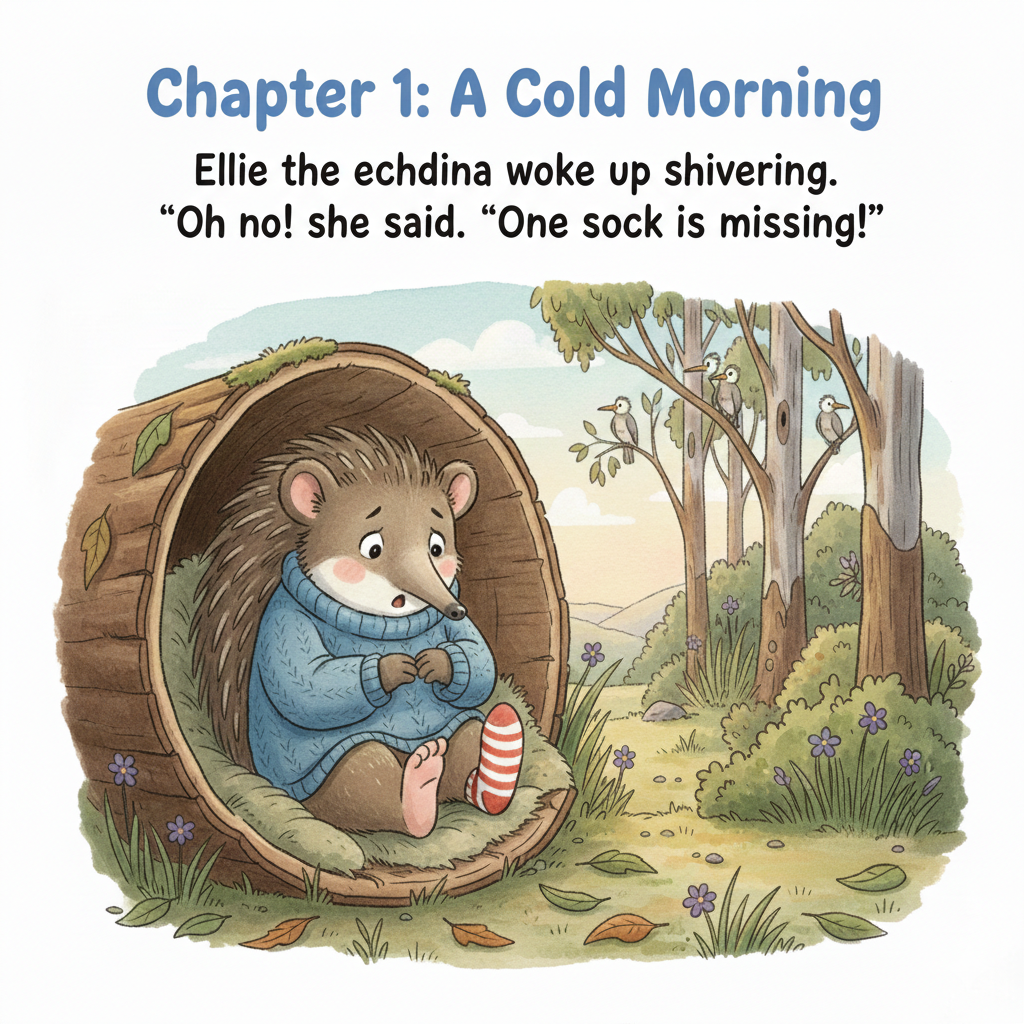 Ellie the echidna woke up shivering. “Oh no!” she said. “One sock is missing!”