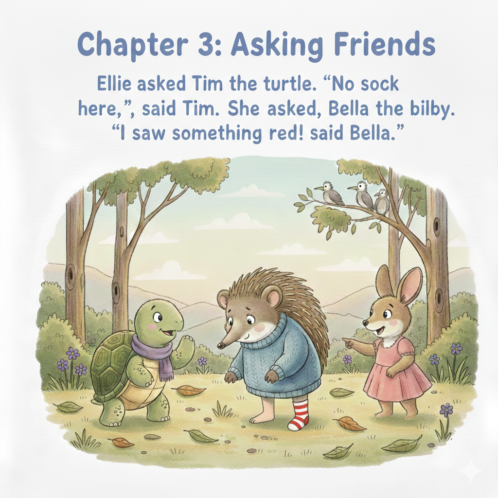 She asked Tim the turtle. “No sock here,” said Tim. She asked Bella the bilby. “I saw something red!” said Bella.