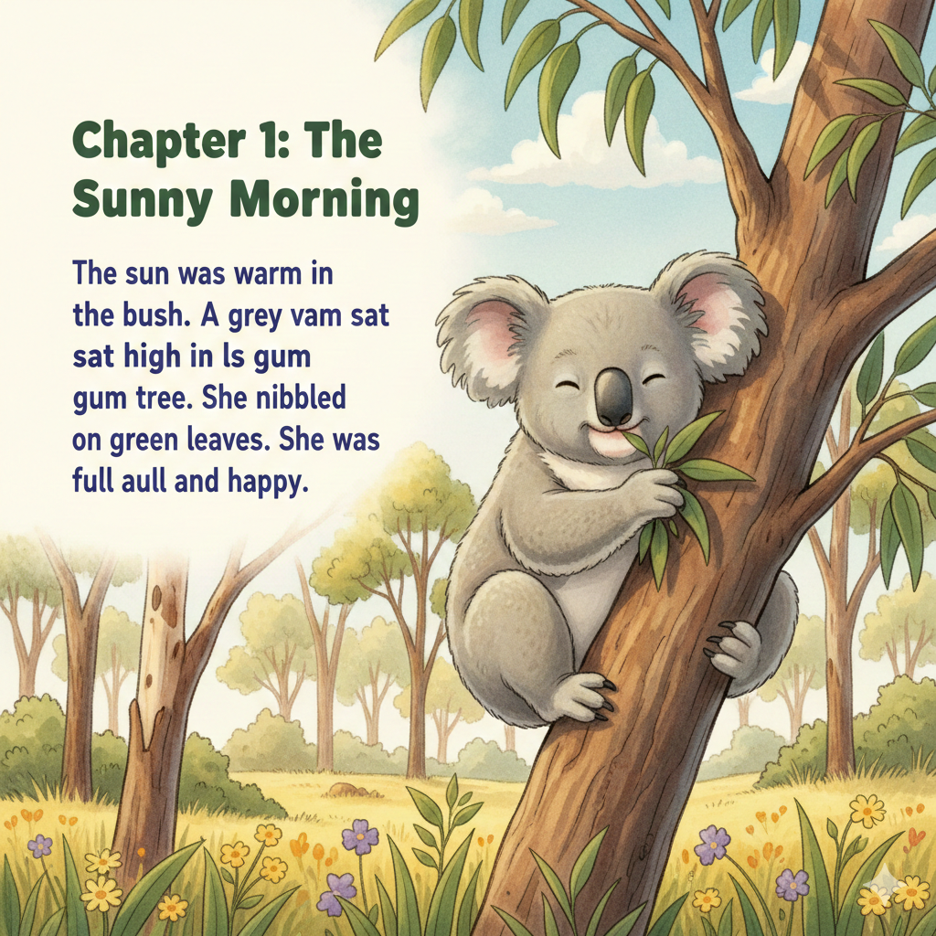 The sun was warm in the bush. A grey koala sat high in a gum tree. She nibbled on green leaves. She was full and happy.