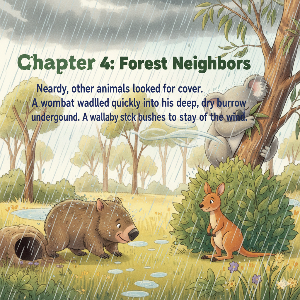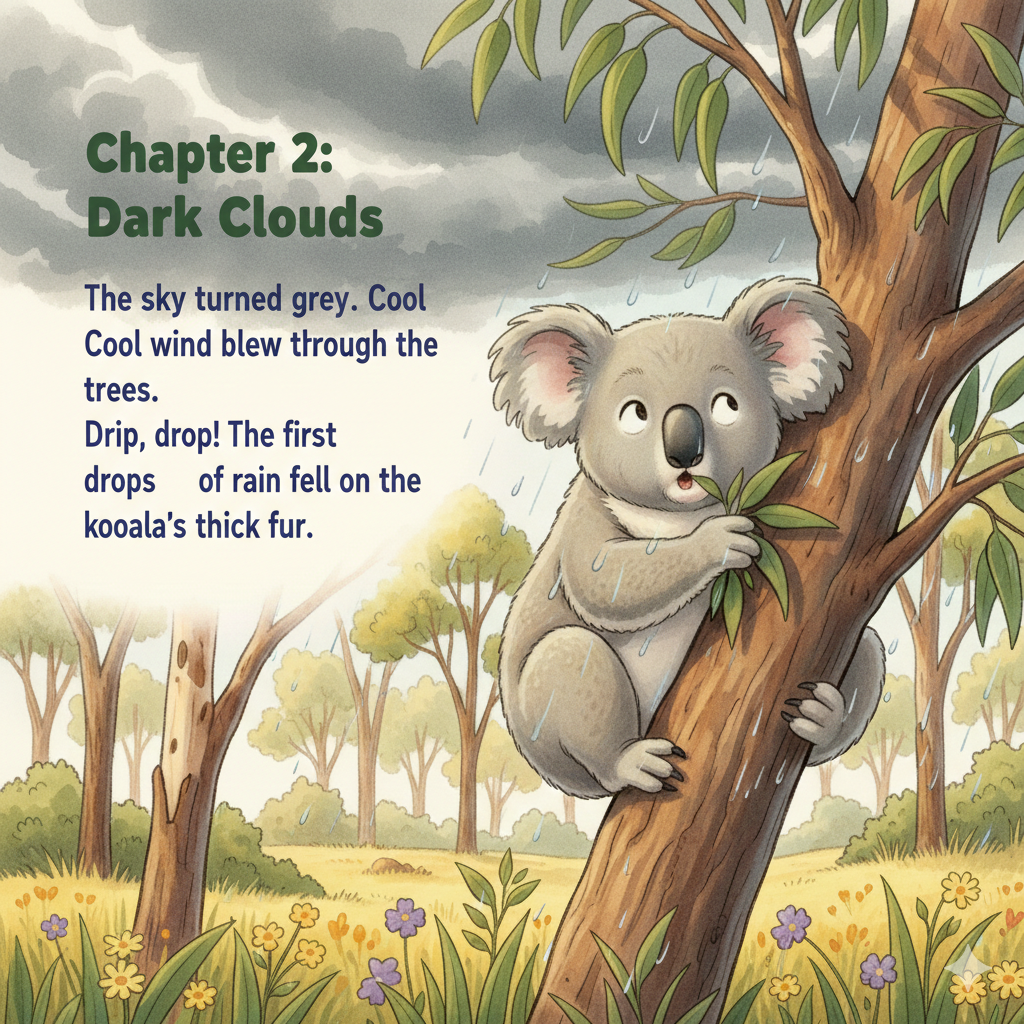 The sky turned grey. Cool wind blew through the trees. Drip, drop! The first drops of rain fell on the koala’s thick fur.