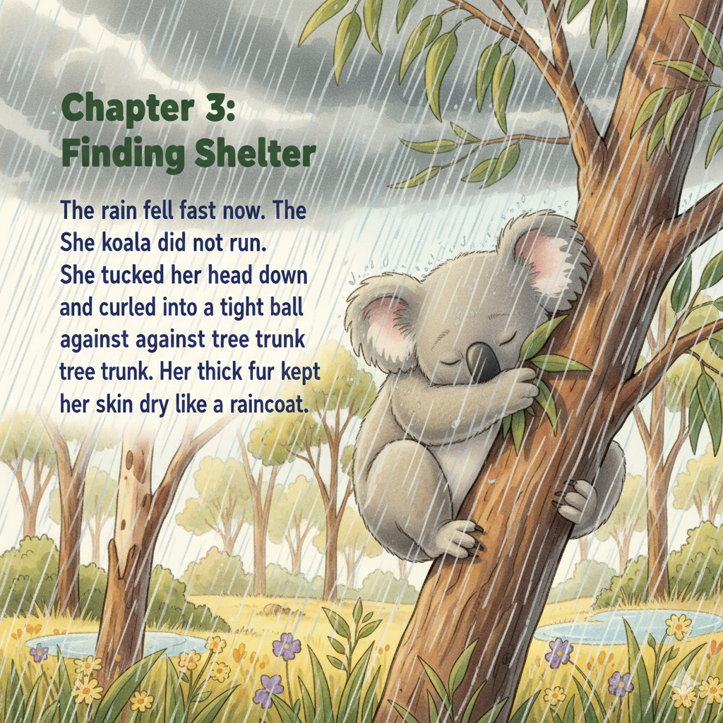 The rain fell fast now. The koala did not run. She tucked her head down and curled into a tight ball against the tree trunk. Her thick fur kept her skin dry like a raincoat.