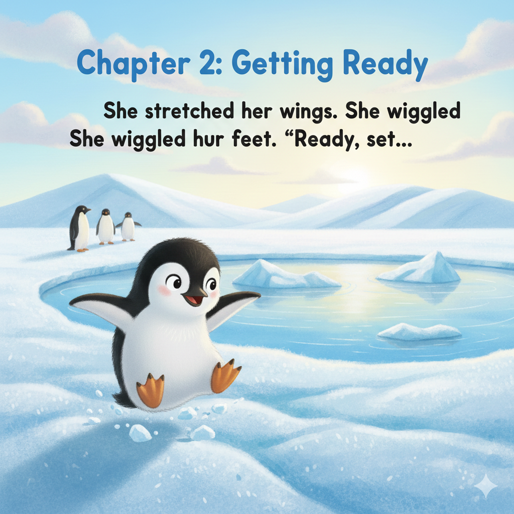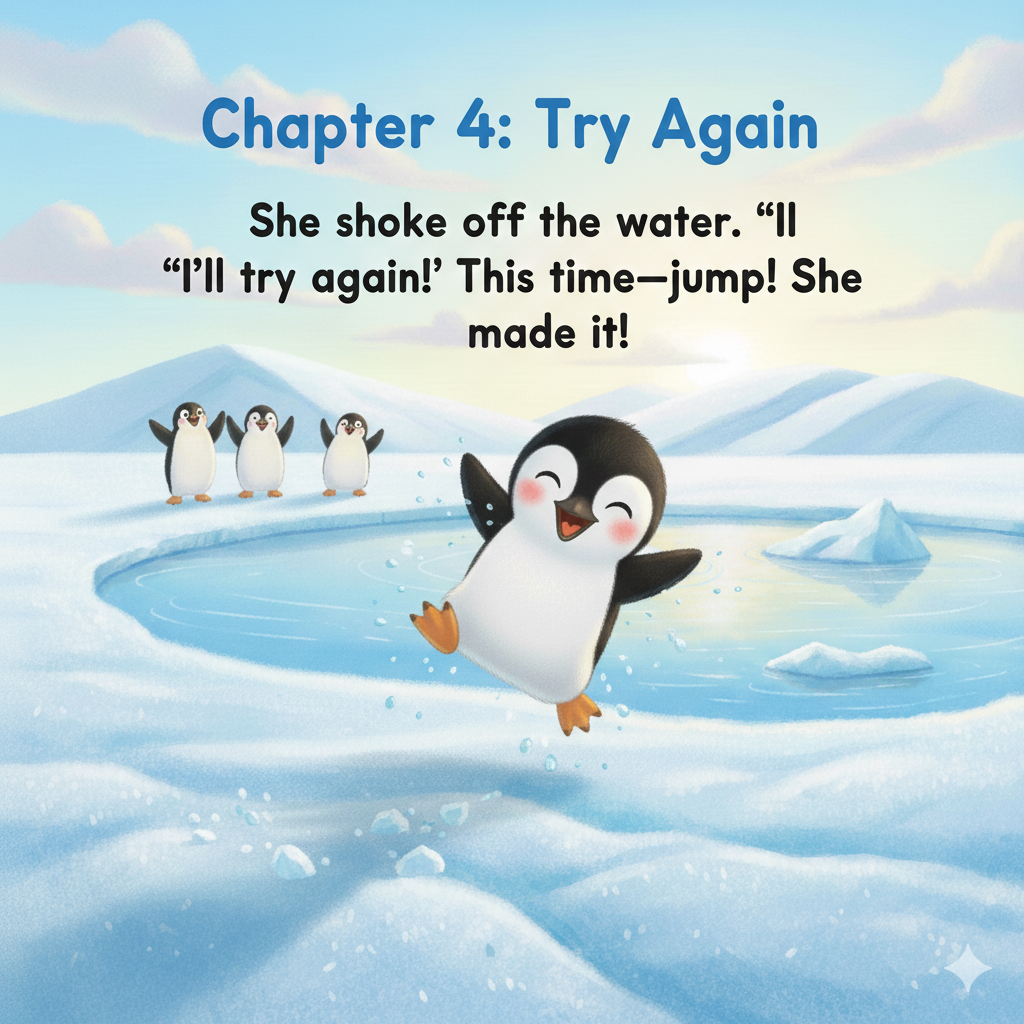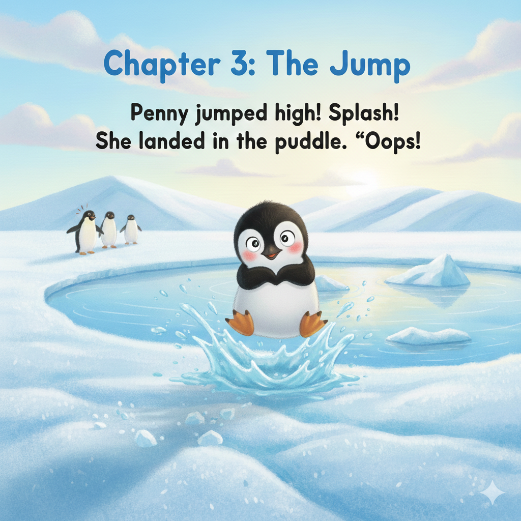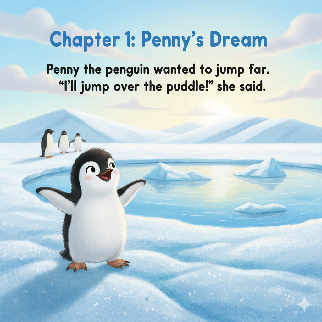 Penny the penguin wanted to jump far. “I’ll jump over the puddle!” she said.