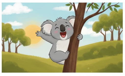 Koko the koala woke up in her gum tree. She stretched her arms and yawned. “Time for breakfast,” she said.
