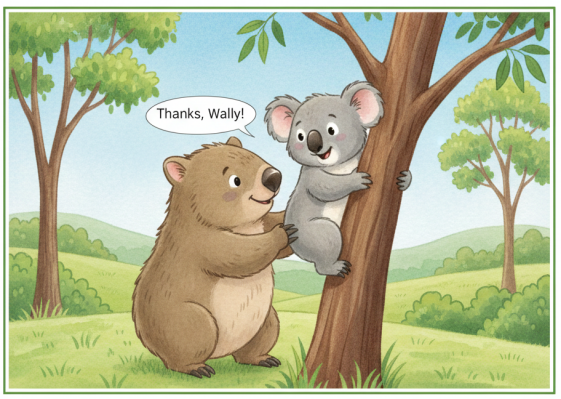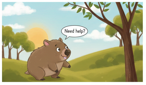 Her friend Wally the wombat saw her. “Need help?” he called. “Yes, please!” Koko replied.