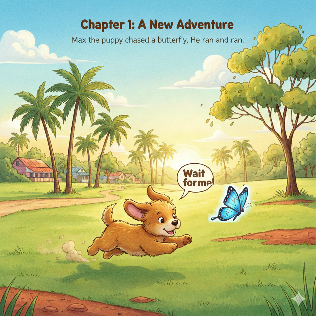 Max the puppy chased a butterfly. He ran and ran. “Wait for me!” he barked.