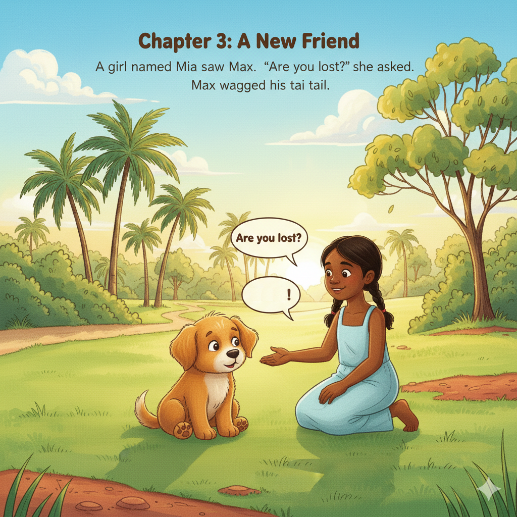 A girl named Mia saw Max. “Are you lost?” she asked. Max wagged his tail.
