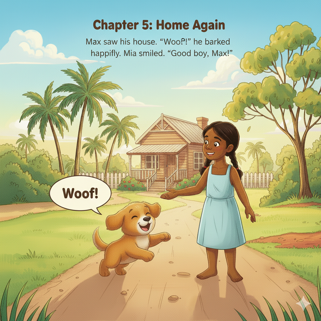 Max saw his house. “Woof!” he barked happily. Mia smiled. “Good boy, Max!”