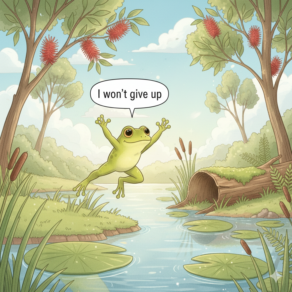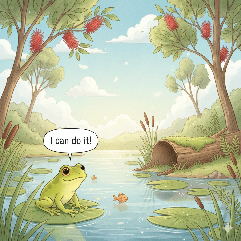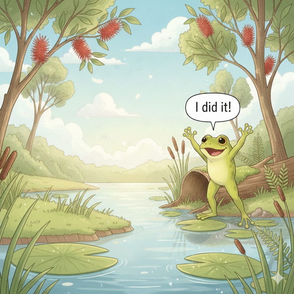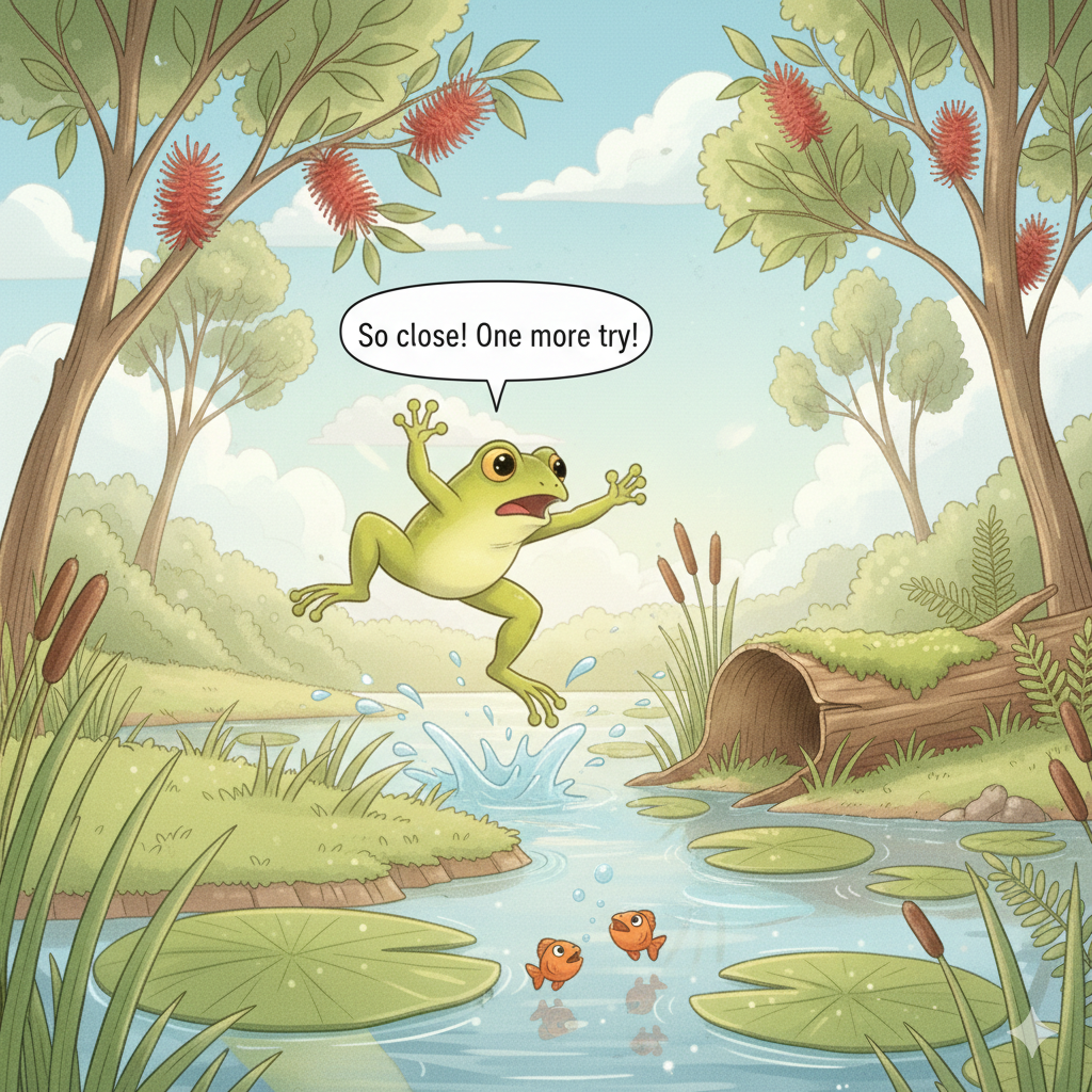 Freddie the frog wanted to jump across the pond. “I can do it!” he said.