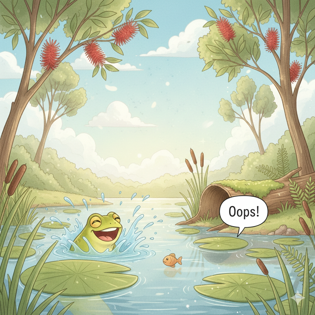Freddie jumped. Splash! He landed in the water. “Oops!” he laughed.