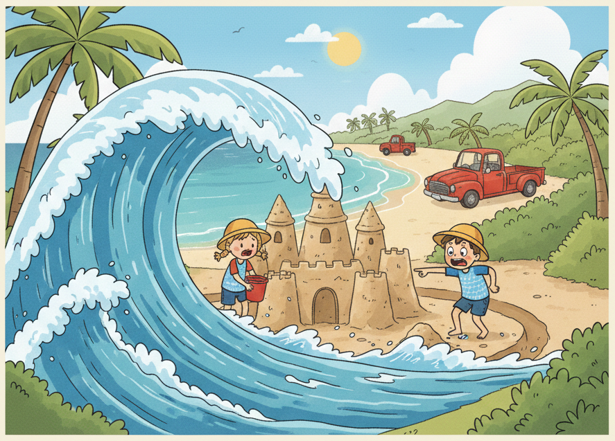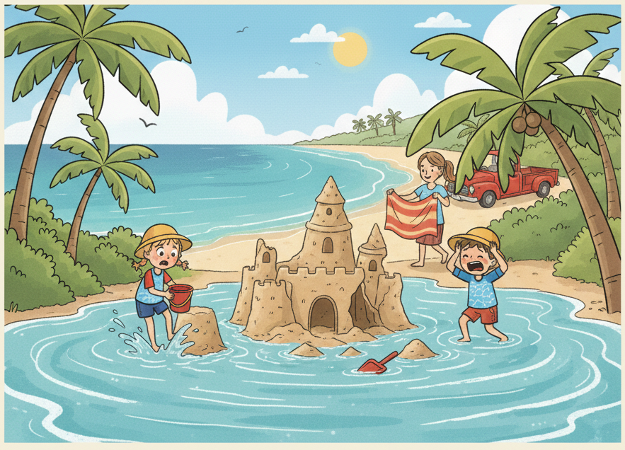 “It’s okay,” said Mum. “That’s what happens at the beach. We can build it again, and this time, we will build it even bigger!” Lily and Tom smiled. They started smoothing out the wet sand. Building sandcastles was the best game.