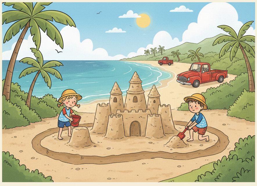 Lily and Tom loved the beach. Today, their Mum drove them in their old, red truck. The truck rattled and bumped down the dirt road. Lily held a bucket and Tom held a spade. “Last one to the water is a rotten egg!” shouted Tom.
