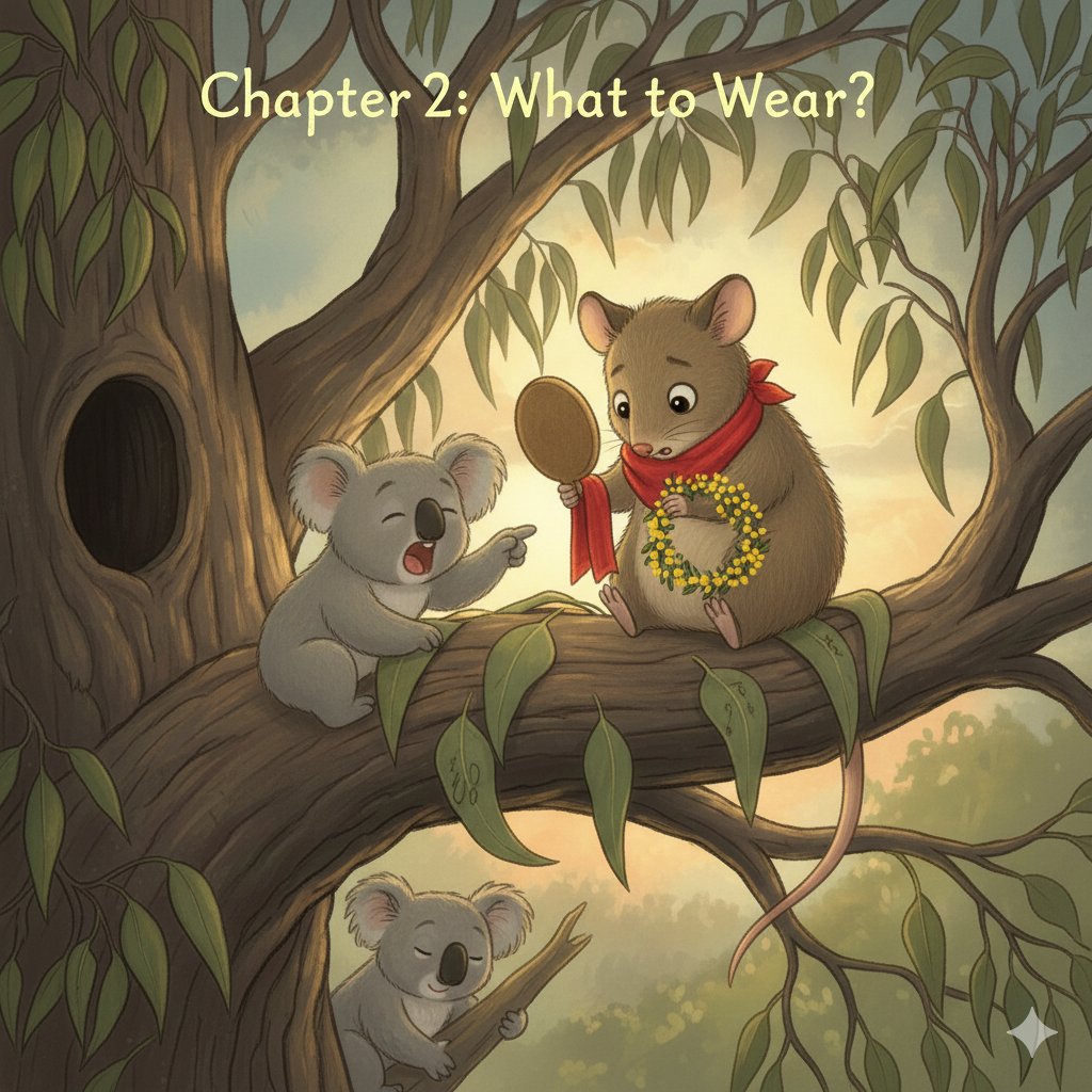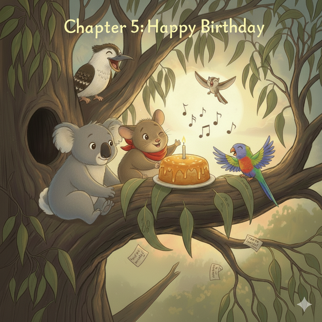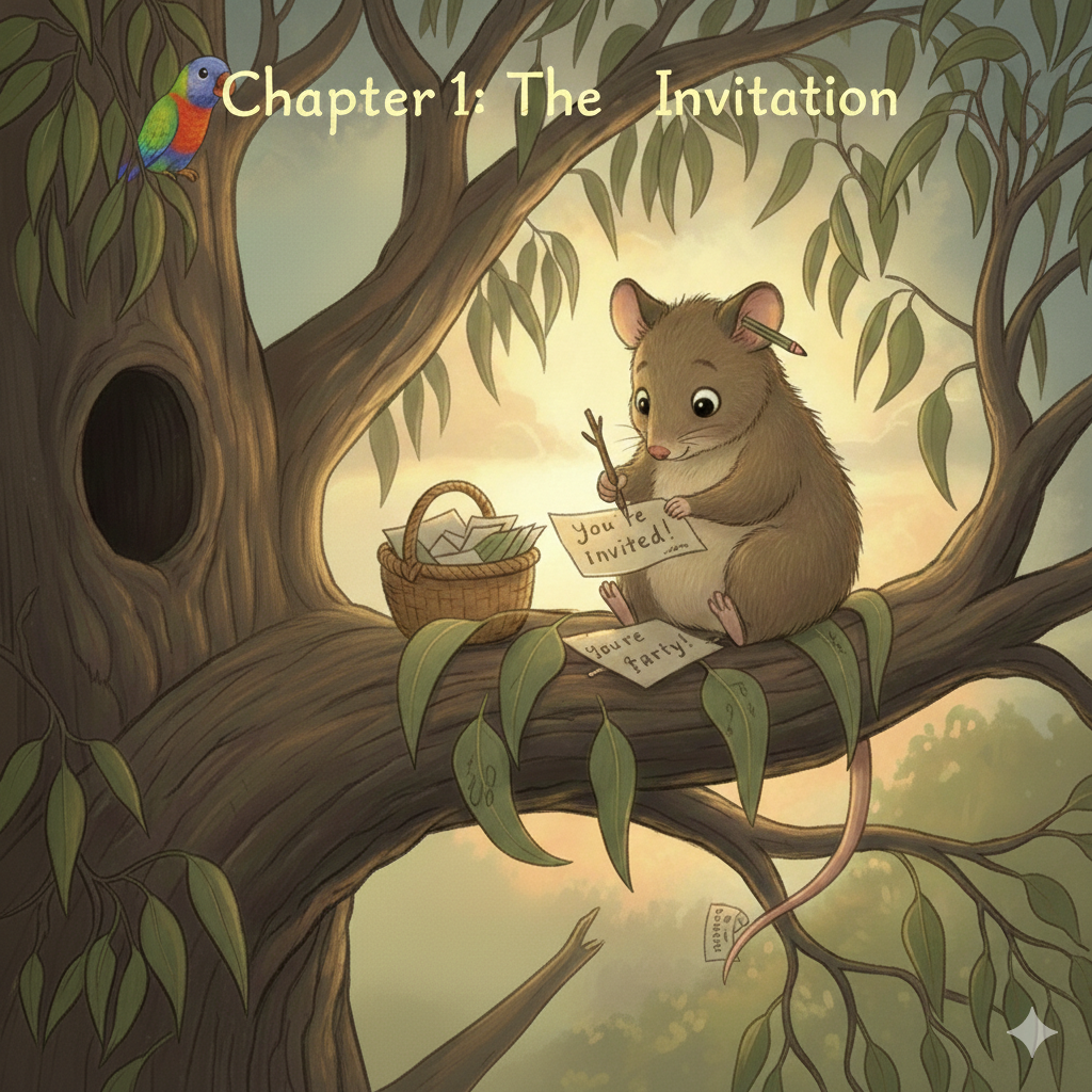 Penny the Possum lived high in a gum tree. Penny was turning seven! She was having a party. She wrote little notes on eucalyptus leaves. The notes were invitations for all her bush friends.