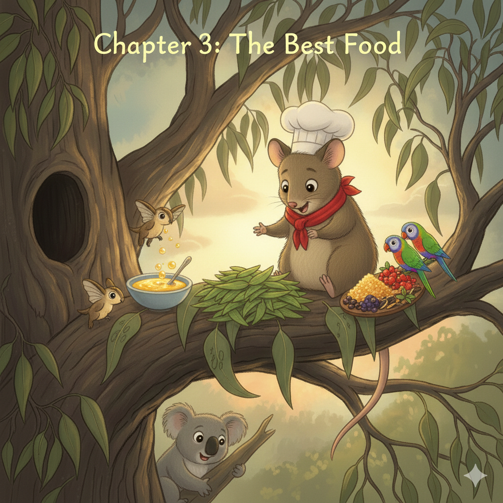 For the party, Penny made lots of yummy food. She had sweet nectar for the sugar gliders. She had crunchy seeds for the parrots. And she had fresh, soft gum leaves for Kevin the Koala. Everything was ready.