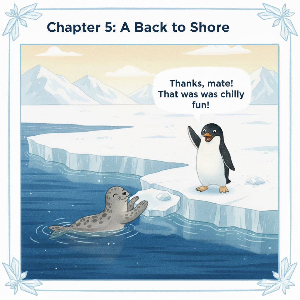 A seal helped push the ice toward land. “Thanks, mate!” said Percy. “That was chilly fun!”