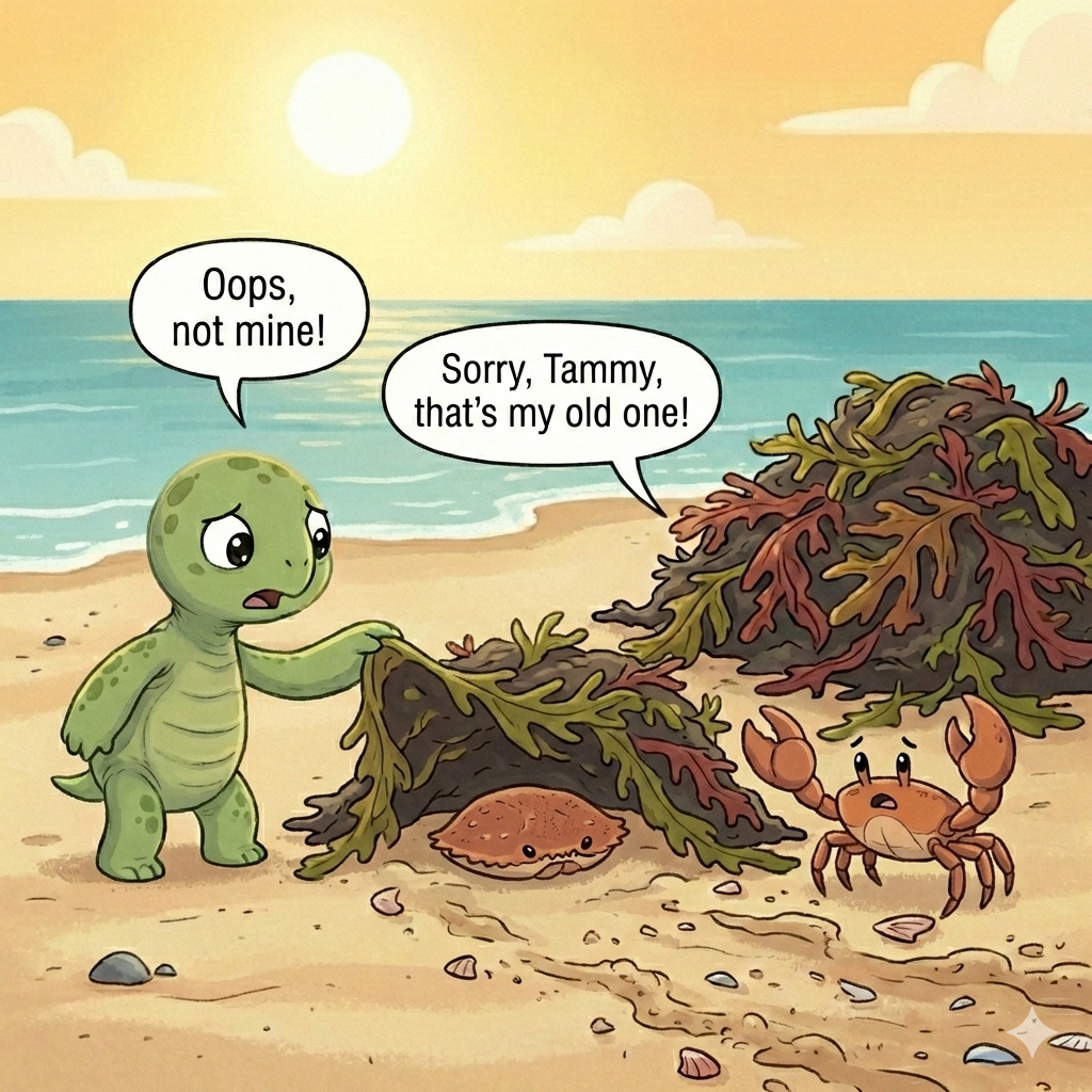 Under the seaweed was a shell—but it was Benny’s old one! “Oops,” said Tammy. “Not mine!”