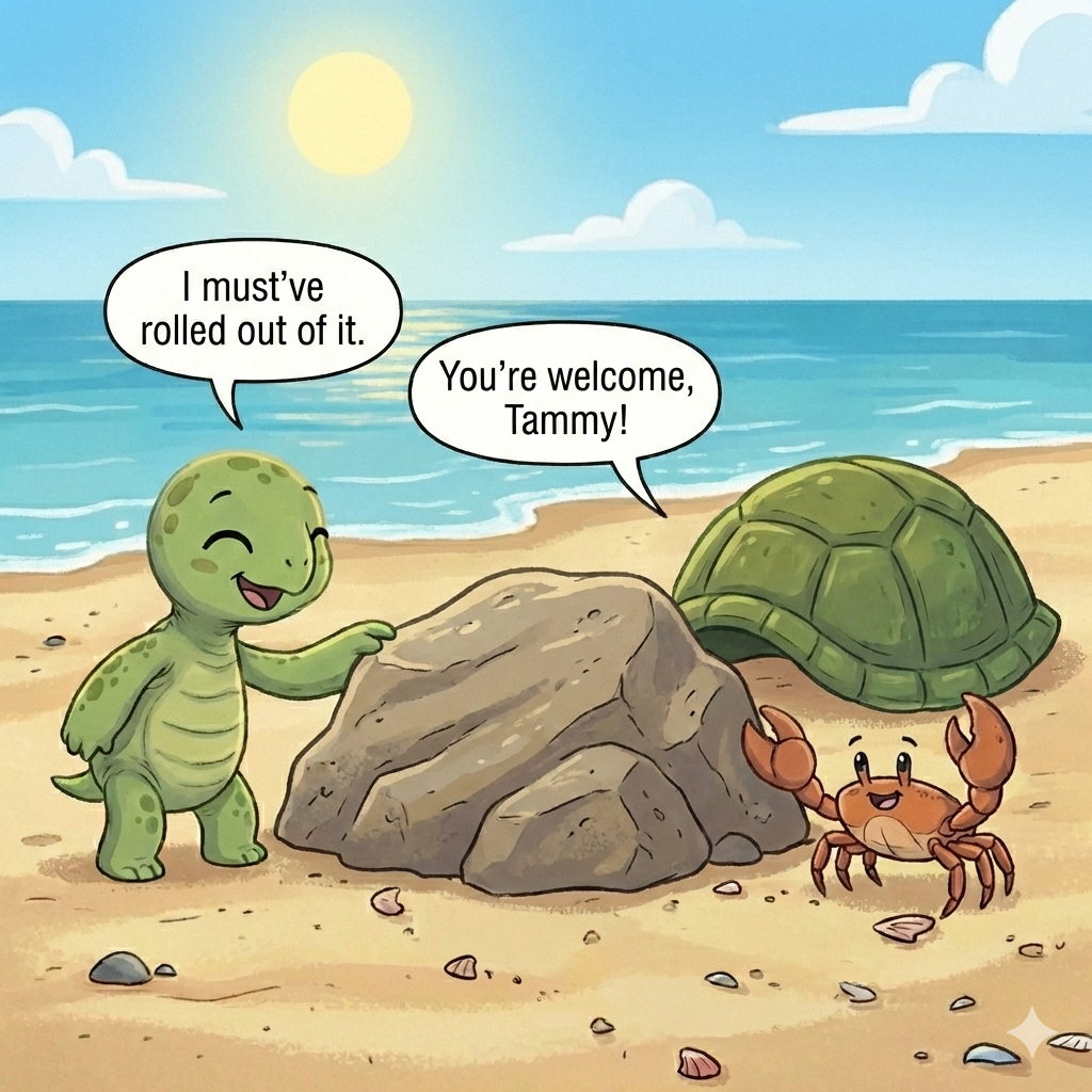 Tammy’s shell was behind a rock. “I must’ve rolled out of it,” she giggled. “Thanks for helping, Benny!”