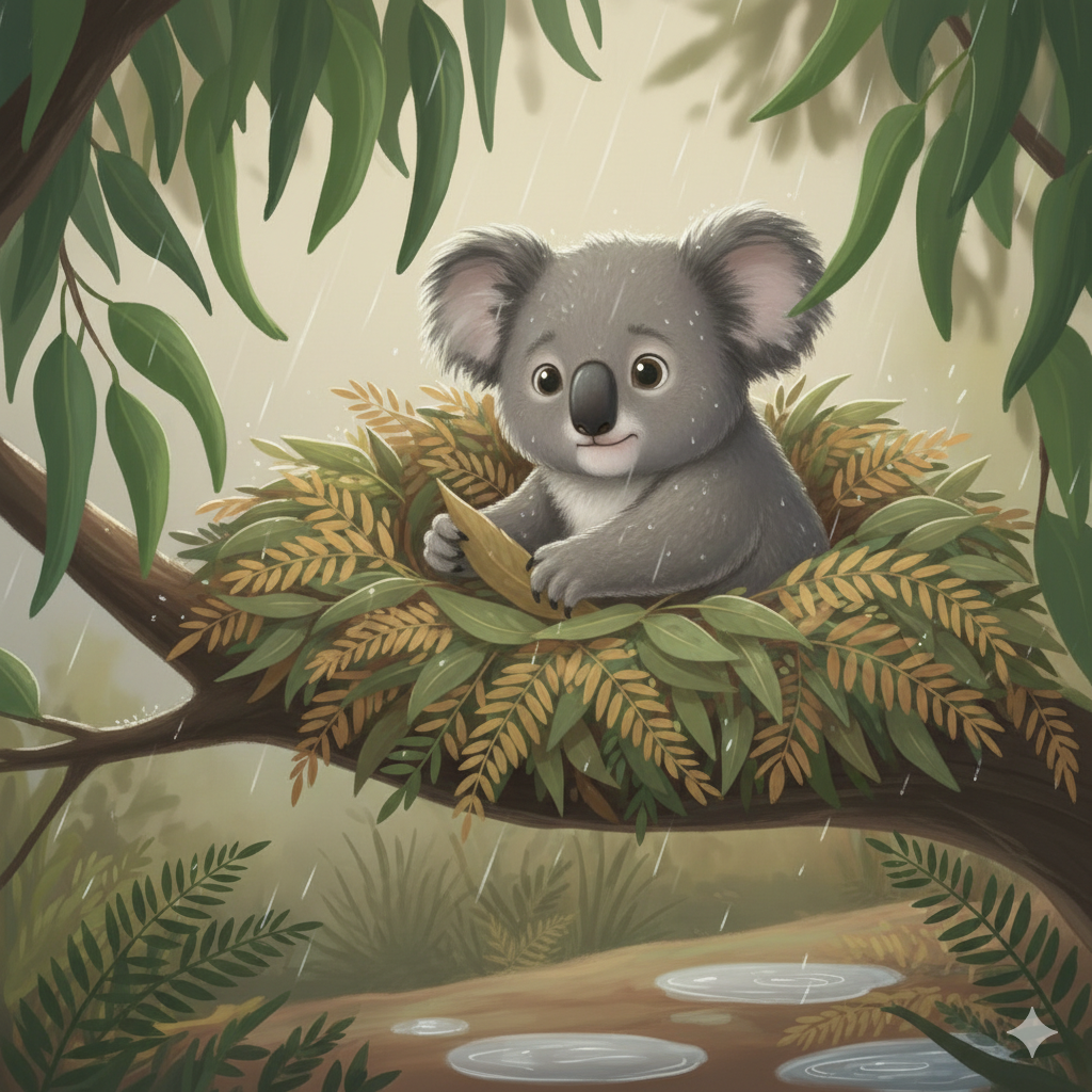 She gathered leaves and made a nest. “I’ll stay warm and dry,” she said.